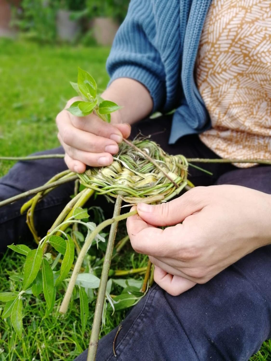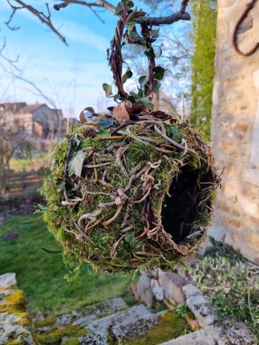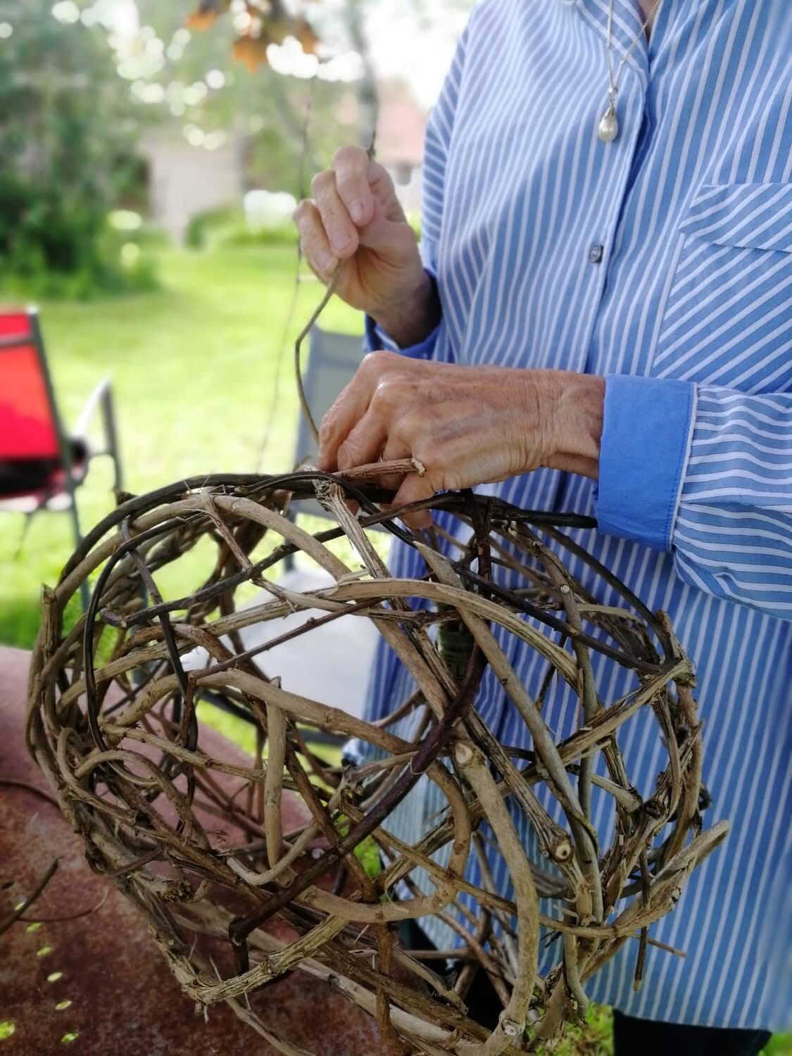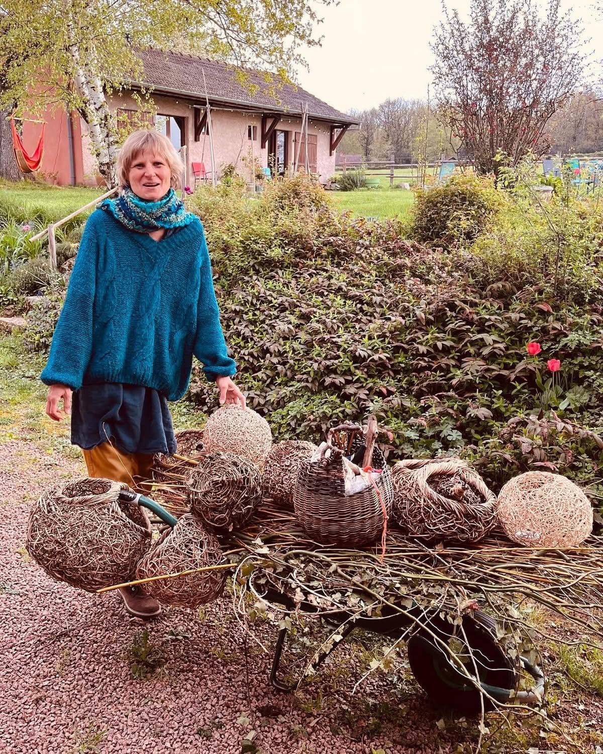 Danielle arrive à pas feutrés au petit matin, sa brouette verte débordant de lianes, tiges et ronces avec l’aspiration de transmettre sa curiosité des cueillettes sauvages et de la vannerie aléatoire. Chaque participant arrive avec des cabas chargés de mousses et verdures glanées dans les jardins, sous les conseils de Danielle qui prend contacte avec vous en amont afin d’organiser votre cueillette. Tout le monde s’installe dans le jardin ou la véranda pour un café avant de choisir le projet à réaliser.