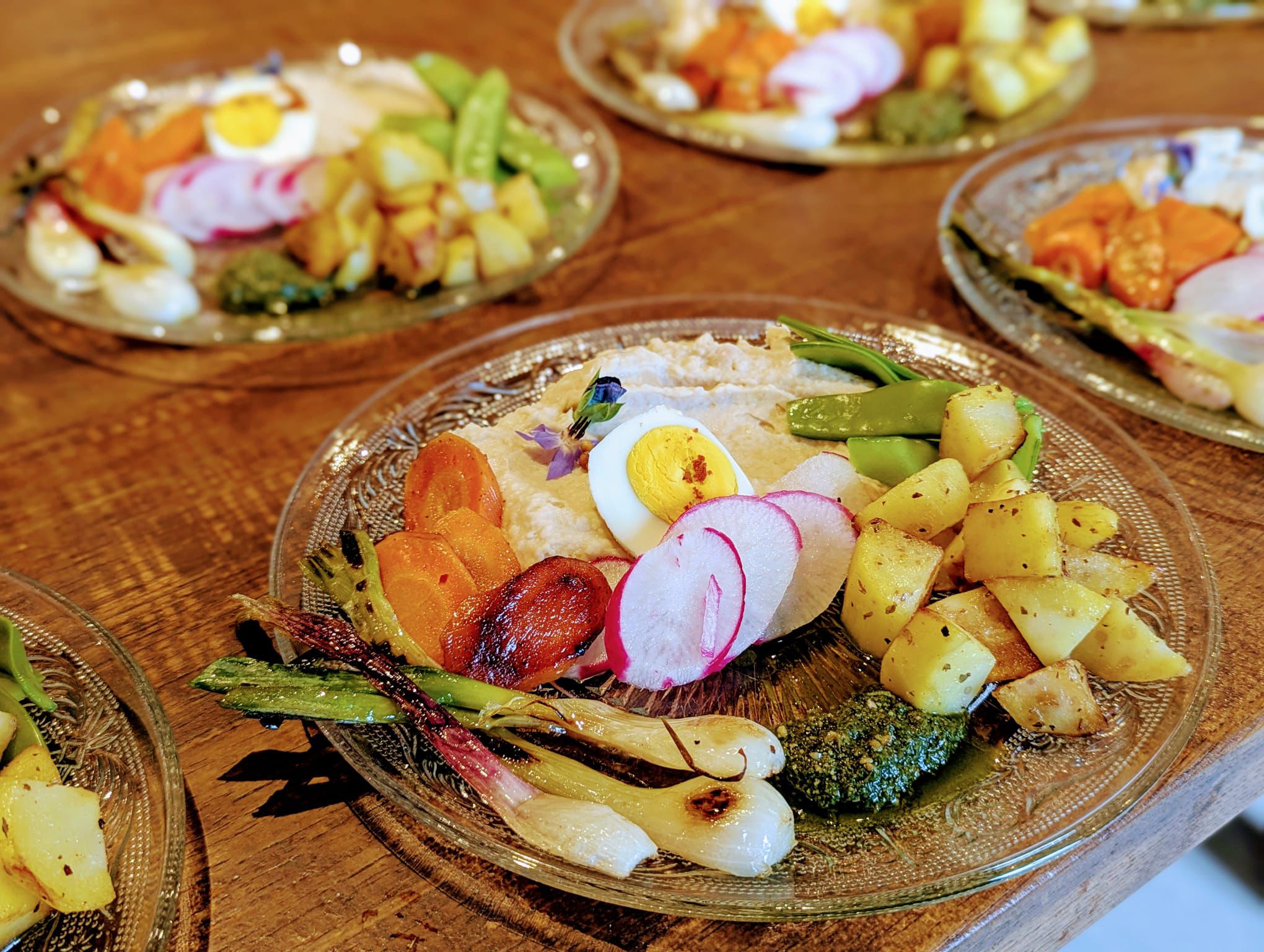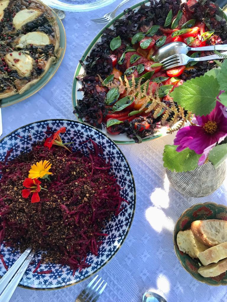 La serre déborde de tomates que vous retrouverez en carpaccio, tomates farcies ou sauce enrobant des boulettes de viandes. Le choux kale passe au four pour croustiller, les fleurs de souci colorent les poireaux aux noisettes et vinaigre de framboise.